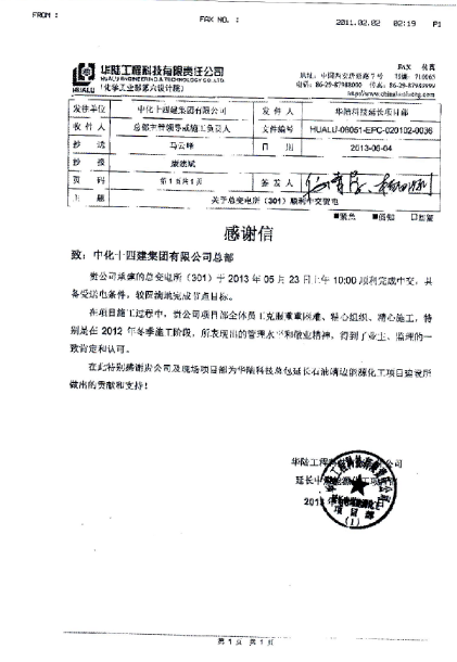 6月6日,公司收到華陸公司延長項(xiàng)目部發(fā)來的感謝信,就我公司承建的總變電所(301)于2013年5月23日具備受送電條件,較圓滿地完成節(jié)點(diǎn)目標(biāo)表示感謝,并對項(xiàng)目施工過程中項(xiàng)目部全體員工不畏艱難,團(tuán)結(jié)拼搏的精神表示贊揚(yáng)。