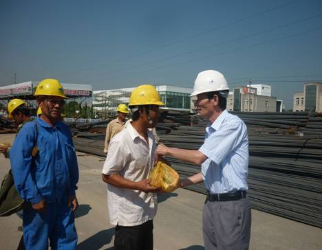 劉主席一行為一線員工發(fā)放了夏季防暑用品,并親切詢問(wèn)了員工的生活和工作情況,叮囑要安全作業(yè),做好防暑降溫工作,并對(duì)大家在烈日下堅(jiān)守崗位,有力保障工程的順利推進(jìn)表示感謝。隨后,劉主席一行與項(xiàng)目部主要管理人員進(jìn)行交流,聽(tīng)取了項(xiàng)目施工進(jìn)展情況匯報(bào),要求項(xiàng)目部一要關(guān)心現(xiàn)場(chǎng)員工生活,合理安排作息時(shí)間,讓全體參戰(zhàn)人員吃好住好休息好;二要關(guān)注安全生產(chǎn),做好夏季施工職業(yè)健康安全防護(hù);三要充分認(rèn)識(shí)干好南京青奧項(xiàng)目的重要意義,通過(guò)在重點(diǎn)工程開展勞動(dòng)競(jìng)賽的有效載體,充分調(diào)動(dòng)員工的積極性,保質(zhì)保量實(shí)現(xiàn)建設(shè)目標(biāo),為南京市政建設(shè)再作貢獻(xiàn)!
