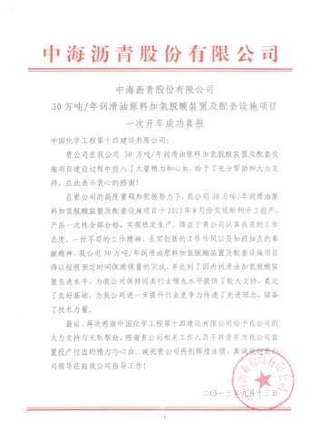9月17日,中海瀝青股份有限公司發(fā)來喜報,就30萬噸/年潤滑油原料加氫脫酸裝置一次開車成功向公司報喜,對我方付出的大量精力和心血表示感謝,并對公司表達了良好的祝愿。