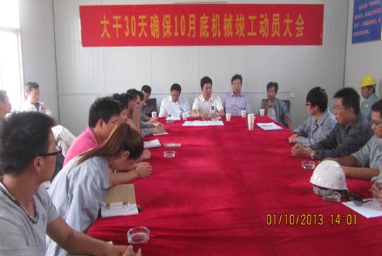 10月1日下午2時(shí),云南公司山東玉皇項(xiàng)目部組織召開了大干30天,確保異丁烯裝置10月底機(jī)械竣工動(dòng)員大會(huì)。業(yè)主方領(lǐng)導(dǎo)、項(xiàng)目部各施工隊(duì)長(zhǎng)及項(xiàng)目部全體管理人員共40余人參加了動(dòng)員大會(huì)。