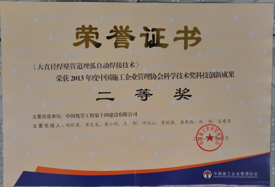 會上,我公司自主開發(fā)的《大直徑厚壁管道埋弧自動焊接技術(shù)》被授予2013年度中國施工企業(yè)管理協(xié)會科學(xué)技術(shù)獎科技創(chuàng)新成果二等獎。