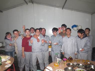 11月7日,連續(xù)下了兩天的小雨依然在下著,晚餐時山東公司煙臺萬華項目部所有項目管理人員聚集在項目部餐廳,為王強、吳顯偉、韓燕軍、欒喜兵、王永強五位年輕員工舉辦了一個簡單的集體生日會。