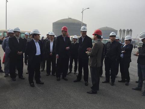 在國家發(fā)改委副主任、能源局局長努爾·白克力一行到達(dá)之前,廣匯集團(tuán)總裁尚繼強(qiáng)首先到達(dá)參觀現(xiàn)場了解項(xiàng)目情況,并與項(xiàng)目經(jīng)理王喜房進(jìn)行了親切握手,并了解項(xiàng)目進(jìn)展情況和LNG儲罐施工工藝,同時提到我單位也參與了廣匯新疆項(xiàng)目的建設(shè)工作,總體對項(xiàng)目建設(shè)情況表示滿意。