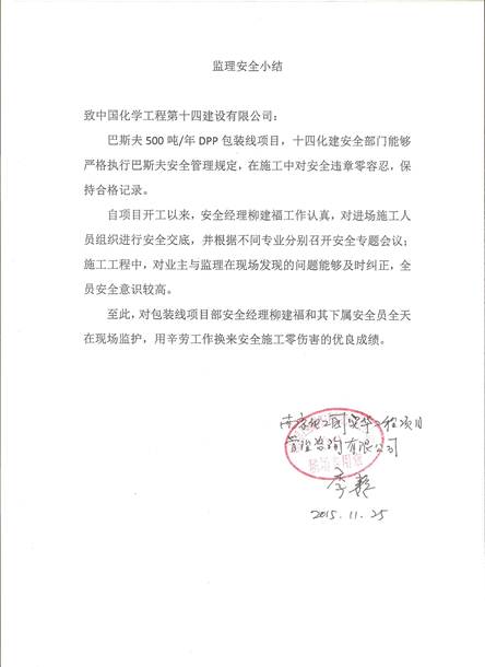 巴斯夫500噸/年包裝線項(xiàng)目施工工作已順利結(jié)束,交工資料基本完成,項(xiàng)目結(jié)算已報(bào)業(yè)主,目前正在審核階段。12月28日,我公司項(xiàng)目部收到巴斯夫項(xiàng)目南京實(shí)華工程項(xiàng)目管理咨詢有限公司贊譽(yù),著重稱贊了我公司嚴(yán)格的安全管理及安全施工要求,順利保證了本項(xiàng)目安全有序地進(jìn)行,做到了安全施工零傷害的優(yōu)異成績(jī)。