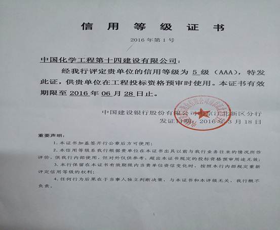 3月18日,公司通過中國(guó)建設(shè)銀行股份有限公司 “AAA”信用等級(jí)的審核評(píng)定,取得了AAA信用等級(jí)證書。