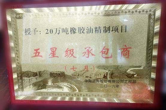 近日,在中海瀝青股份有限公司組織評選的“優(yōu)秀承包商”活動中,南京機械廠20萬噸/年橡膠油技改項目部榮獲“五星級承包商”稱號。