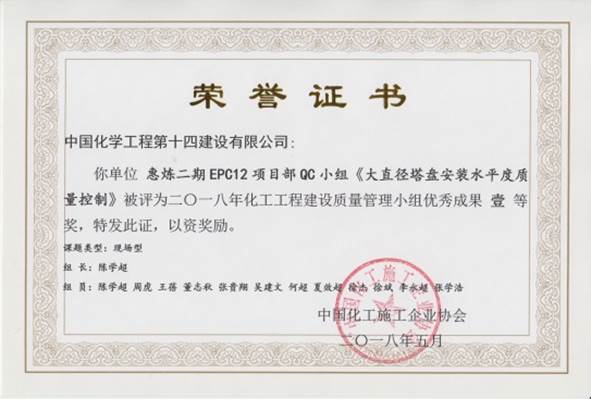 中國化工施工企業(yè)協(xié)會優(yōu)秀QC小組活動成果發(fā)布交流會于4月21-24日在四川南充召開,本次QC成果發(fā)布交流會共收到各企業(yè)申報成果76項(xiàng),根據(jù)評委的評審和現(xiàn)場的發(fā)布,共評出了一等獎21項(xiàng),我公司的《創(chuàng)新110KV油浸式電力變壓器安裝施工方法》和《大直徑塔盤安裝水平度質(zhì)量控制》兩項(xiàng)QC成果榮獲一等獎。