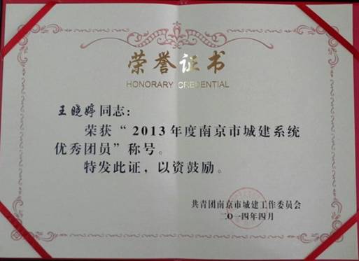 近日,南京城建團(tuán)工委下發(fā)文件,對2013年度南京市城建系統(tǒng)先進(jìn)集體和個(gè)人進(jìn)行表彰,我公司市政工程公司團(tuán)支部榮獲“2013年度南京市城建系統(tǒng)先進(jìn)團(tuán)支部”稱號,華南公司的王曉婷榮獲“2013年度南京市城建系統(tǒng)優(yōu)秀團(tuán)員”稱號。
