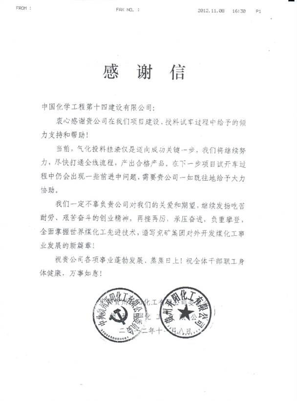 11月8日,貴州開陽化工有限公司向我公司發(fā)來感謝信,就我公司在項(xiàng)目建設(shè)、投料試車過程中給予的支持和幫助表示感謝。
