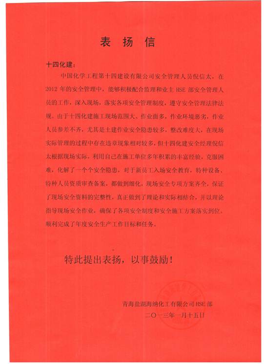 1月21日下午,由青海鹽湖海納聚氯乙烯一體化項(xiàng)目業(yè)主、監(jiān)理組織的年終會(huì)上,西北公司鹽湖海納項(xiàng)目經(jīng)理部倪信太同志受到業(yè)主與監(jiān)理HSE部門(mén)的表?yè)P(yáng)。