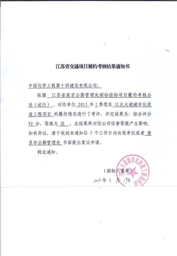 3月20日,市政公司江北大道項(xiàng)目部接到南京市江北大道城市化改造工程指揮部2013年一季度項(xiàng)目履約考核通知書。